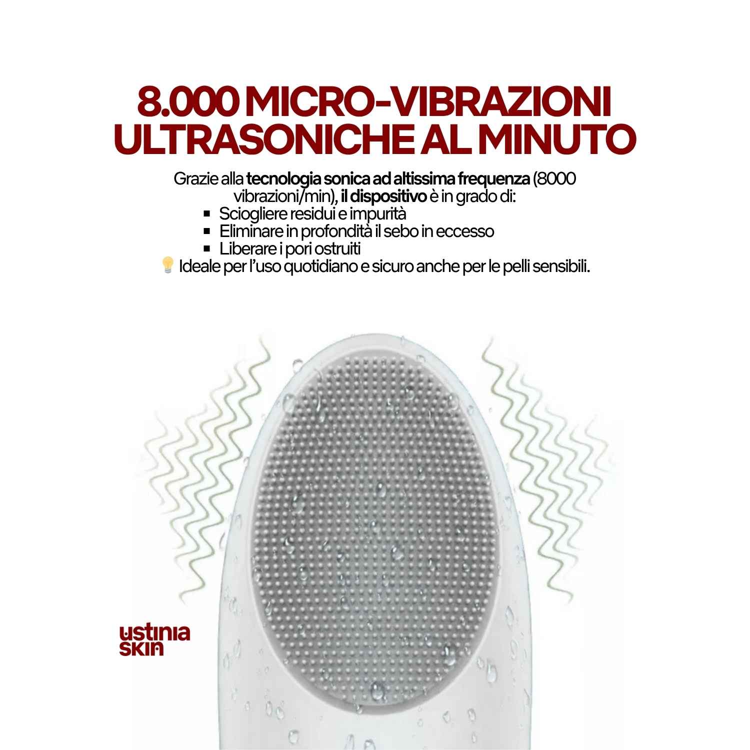 Spazzola sonica DuPont® ultra-delicata: 30.000 setole in silicone alimentare per una detersione efficace ma non abrasiva, ideale anche per pelli sensibili.