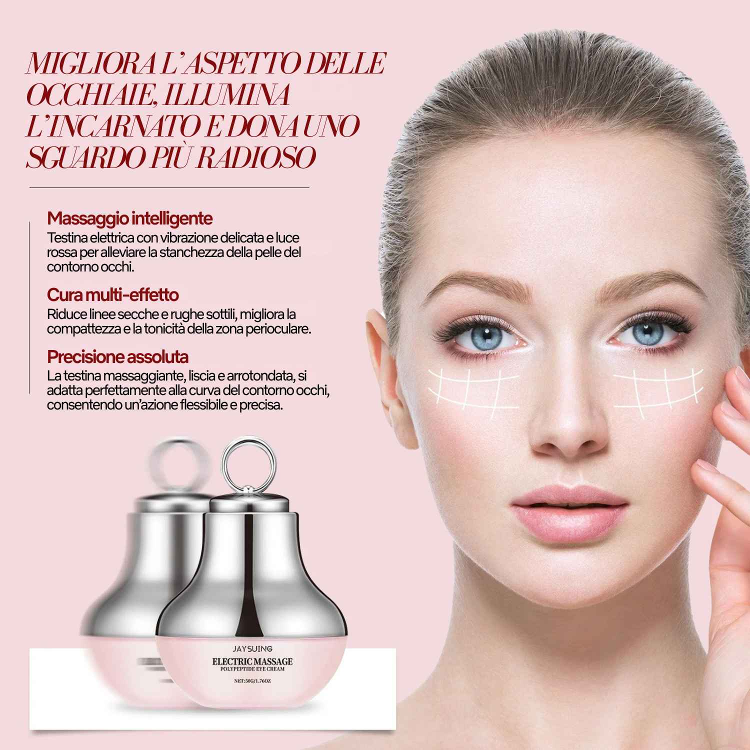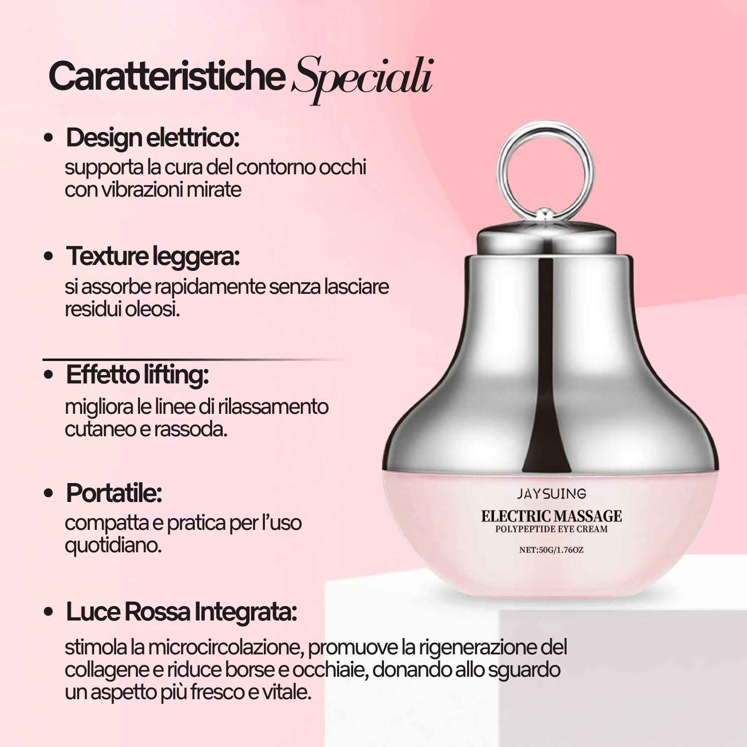 La Jaysuing Electric Eye Cream unisce attivi nutrienti, una testina massaggiante elettrica e la terapia con luce rossaper regalarti uno sguardo visibilmente più giovane, luminoso e compatto.